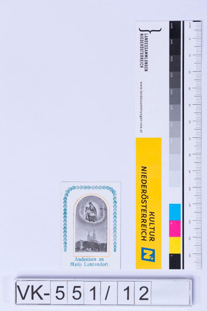 Vorderseite: Gnadenbild Maria Lanzendorf (Pieta), Kirchendarstellung, Beschriftung; Rückseite: Spruch