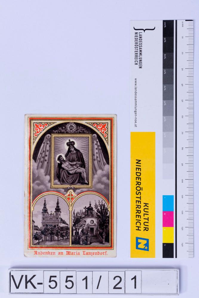 Vorderseite: Gnadenbild Maria Lanzendorf (Pieta), Kirchendarstellung, Beschriftung; Rückseite: Nachricht zum Gnadenort Maria Lanzendorf
