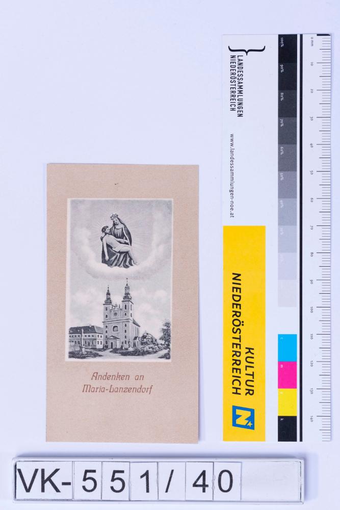 Vorderseite: Gnadenbild Maria Lanzendorf (Pieta), Kirchendarstellung, Beschriftung; Rückseite: Bittgesuch