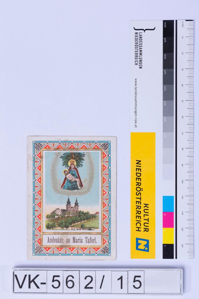 Vorderseite: Gnadenbild Maria Taferl mit Darstellung der Basilika, Beschriftung: "Andenken an Maria Taferl"; Rückseite: Gebet