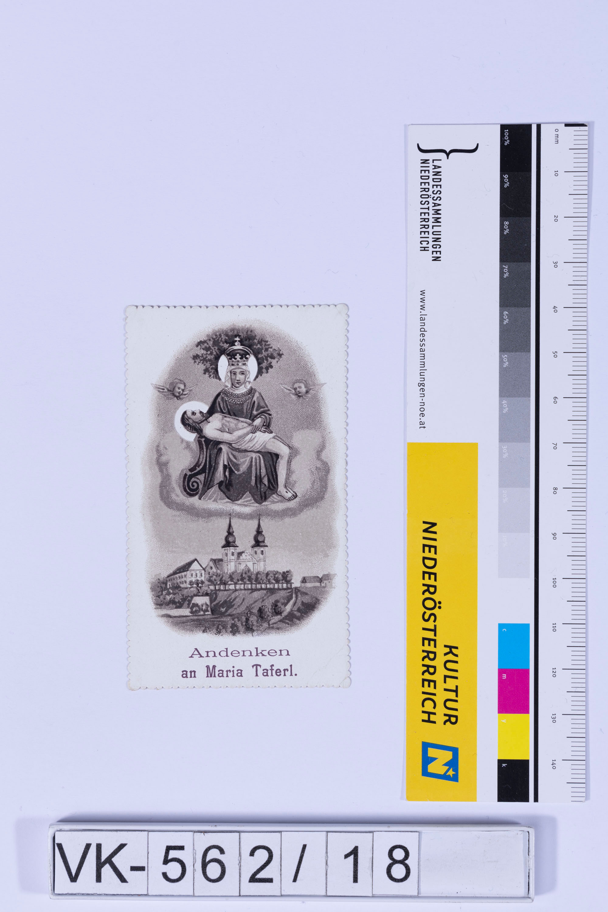 Vorderseite: Gnadenbild Maria Taferl mit Darstellung der Basilika, Beschriftung: "Andenken an Maria Taferl" ; Rückseite: Bittgesuch