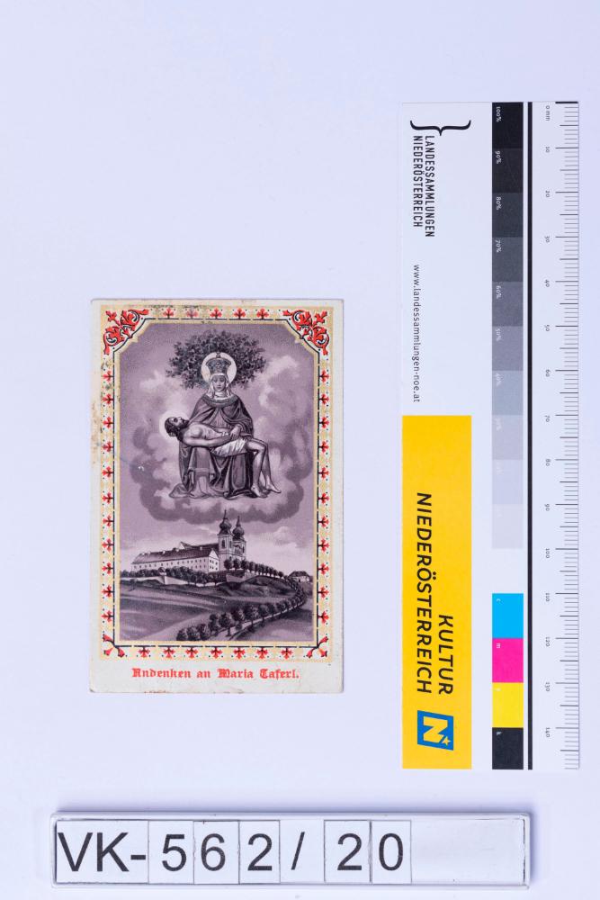 Vorderseite: Gnadenbild Maria Taferl mit Darstellung der Basilika, Beschriftung: "Andenken an Maria Taferl"; Rückseite: Bittgesuch