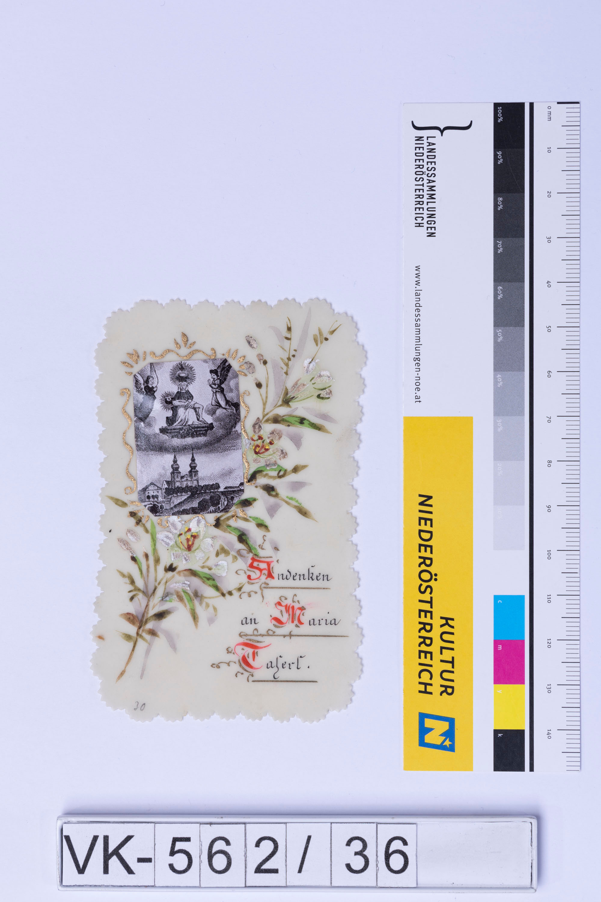Gnadenbild Maria Taferl mit Darstellung der Basilika; Beschriftung: "Andenken an Maria Taferl", stilisiert florales Dekor