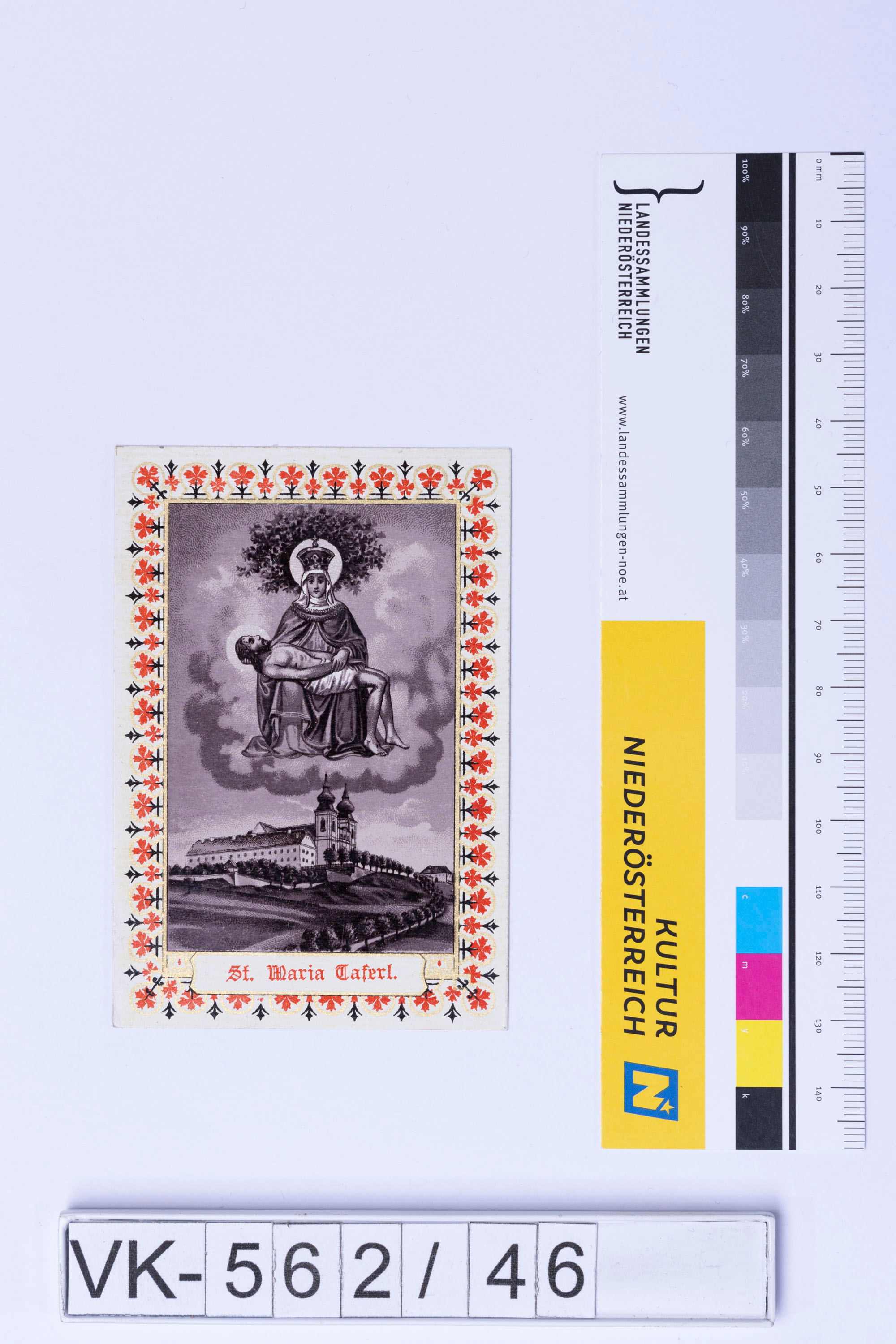 Vorderseite: Gnadenbild Maria Taferl mit Darstellung der Basilika, Beschriftung: "St. Maria Taferl"; Rückseite: Fürbitte