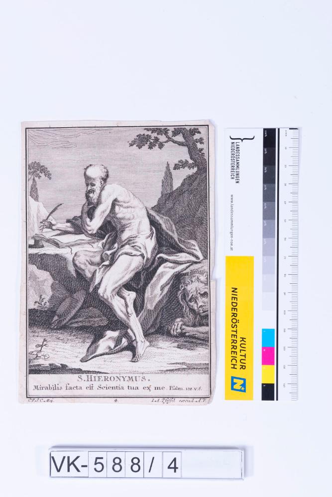 Heiligendarstellung (Hieronymus) mit Feder, Buch und Löwe in einer ländlichen Szenerie, Inschrift
