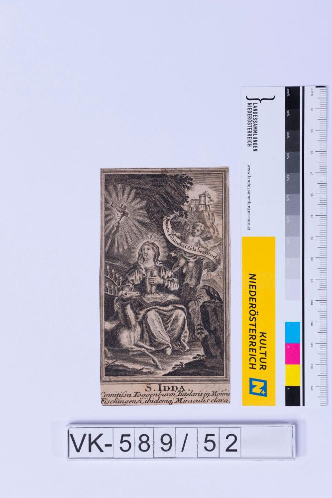 Heiligendarstellung (Ida) beim Gebet mit Hirsch und Kreuz in einer ländlichen Szenerie mit Burganlage, lateinische Inschrift