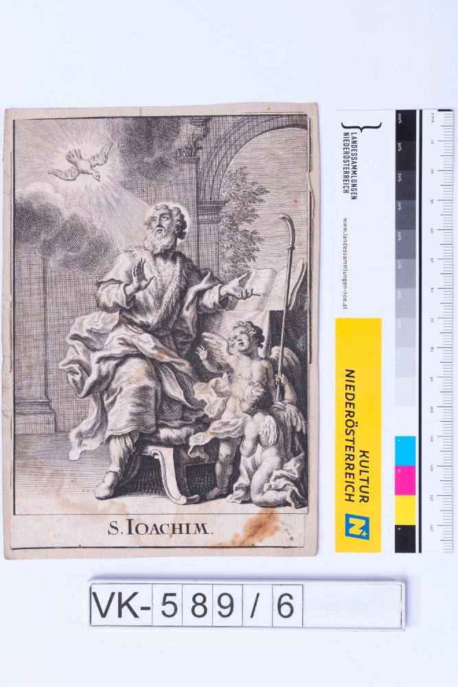 Vorderseite: Heiligendarstellung (Joachim) mit Buch und Engel mit Stab in einer Gebäudeszenerie, herabblickender Heiliger Geist; Rückseite: handschriftliche Notiz