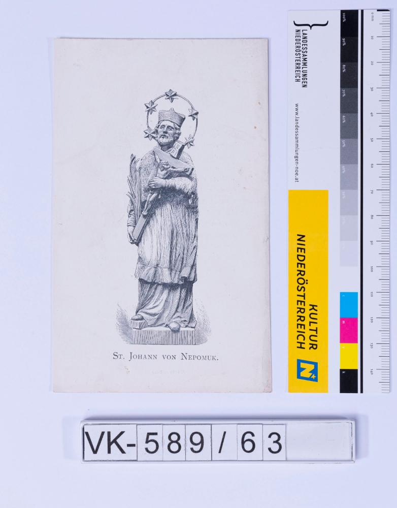 Vorderseite: Heiligendarstellung (Johann der Täufer) mit Kreuz und Palme; Rückseite: Gebet