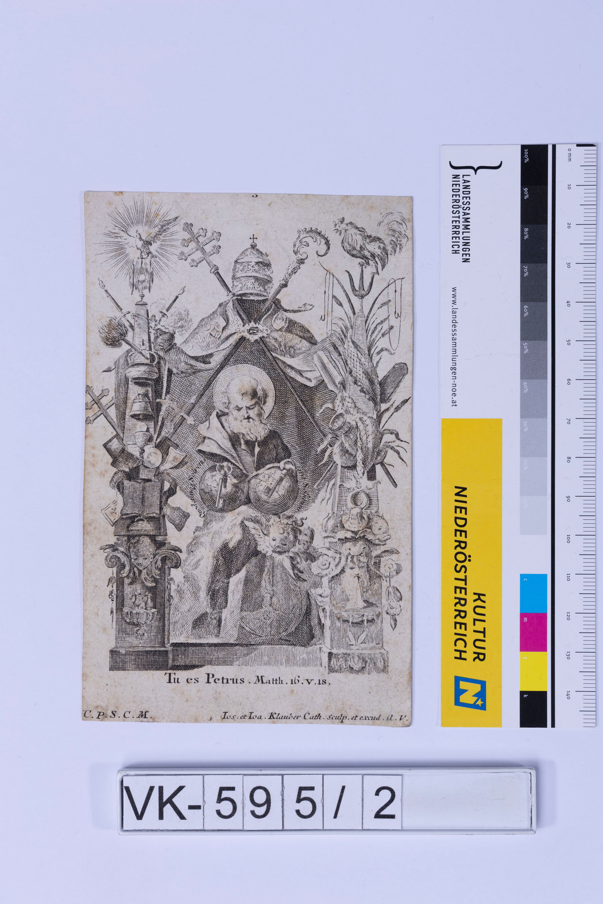 Heiligendarstellung (Petrus) mit Schlüssel, Tiara, Stab, Hahn und Heiligen Geist, lateinische Beschriftung