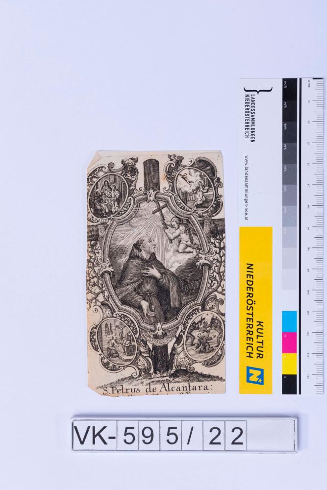 Heiligendarstellung (Petrus von Alcantara in Ordensgewand) mit Engel und Kreuz, eingefasst von Heiligenszenen, Beschriftung