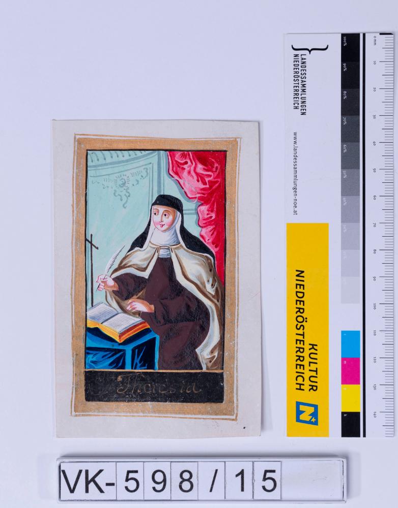 Heiligendarstellung (Theresia in Ordensgewand) mit Feder, Buch und Kreuz in einer Gebäudeszenerie