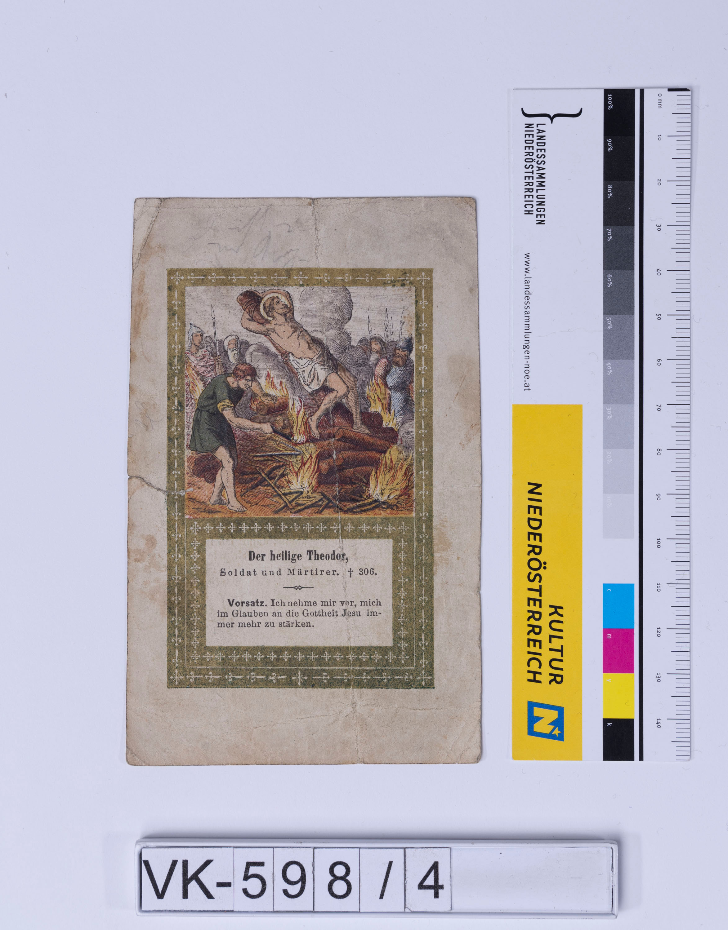 Vorderseite: Heiligendarstellung (Theodor) mit Märtyrertod (Verbrennung), Spruch; Rückseite: Vita, Bittgesuch