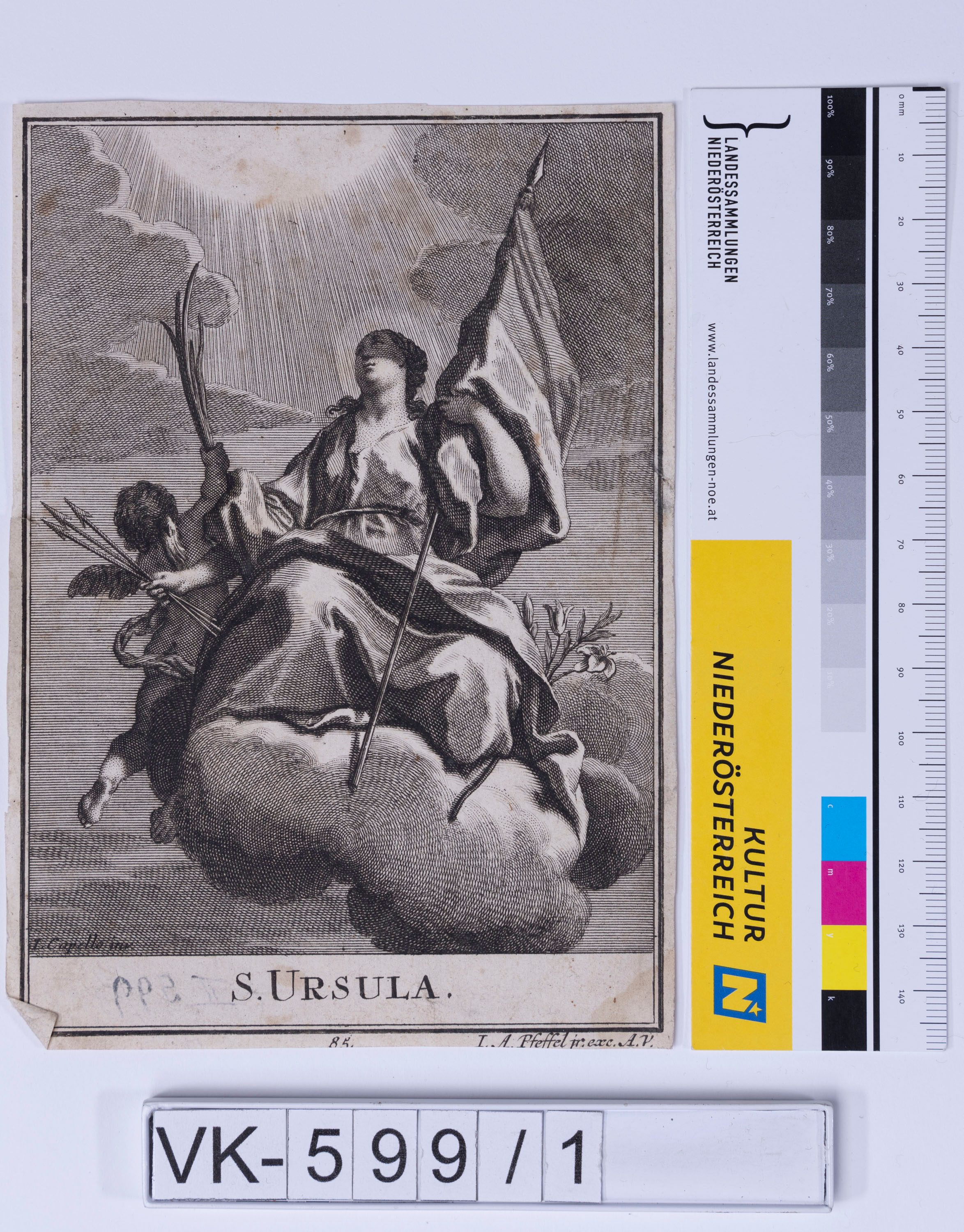 Heiligendarstellung (Ursula) mit Lanze, Pfeile, Engel und Märtyrerpalme in himmlischer Szenerie