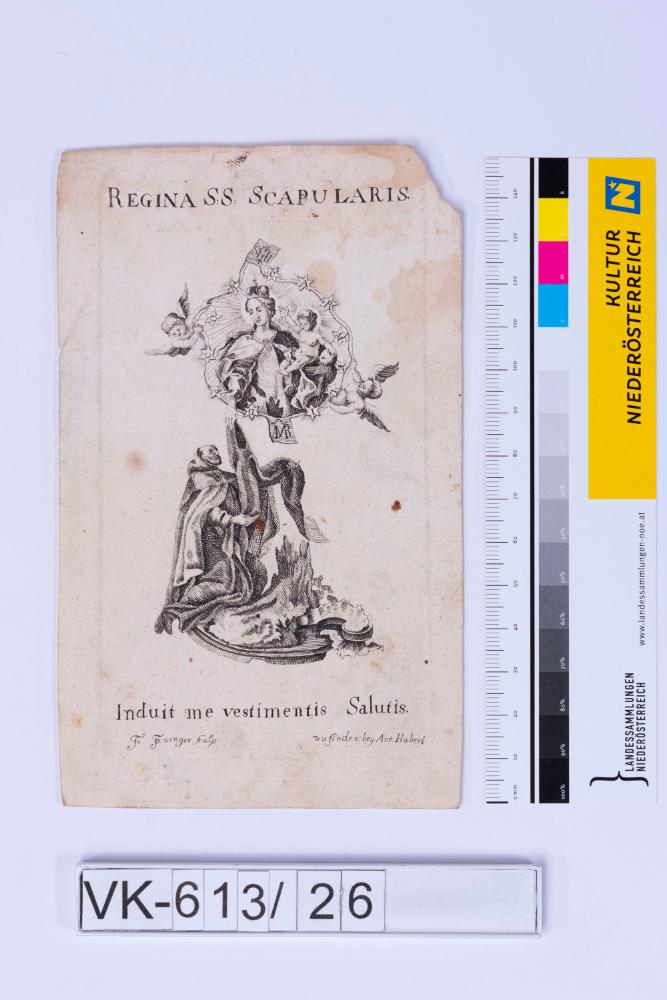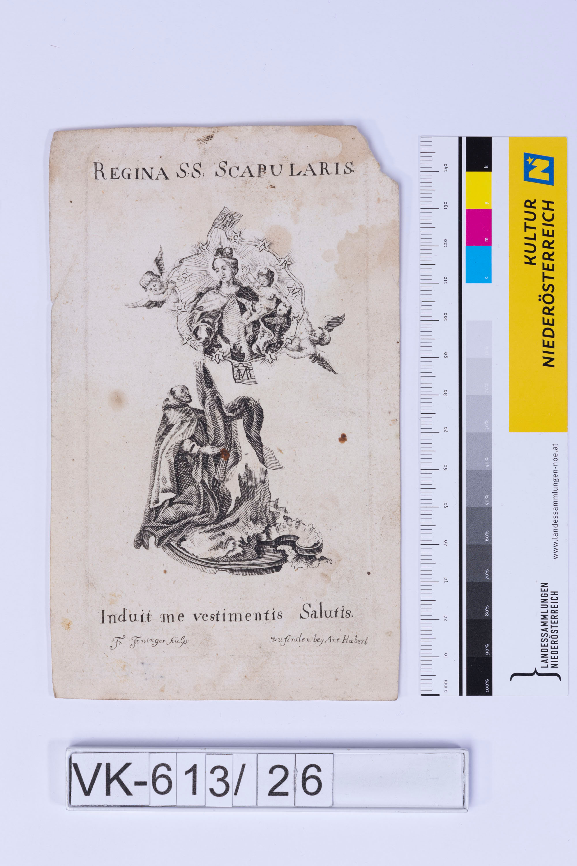 Heiligendarstellung (Maria) mit Kind und Engel, herabblickend auf einen Geistlichen; Beschriftung: "REGINA SS SCAPULARIS"