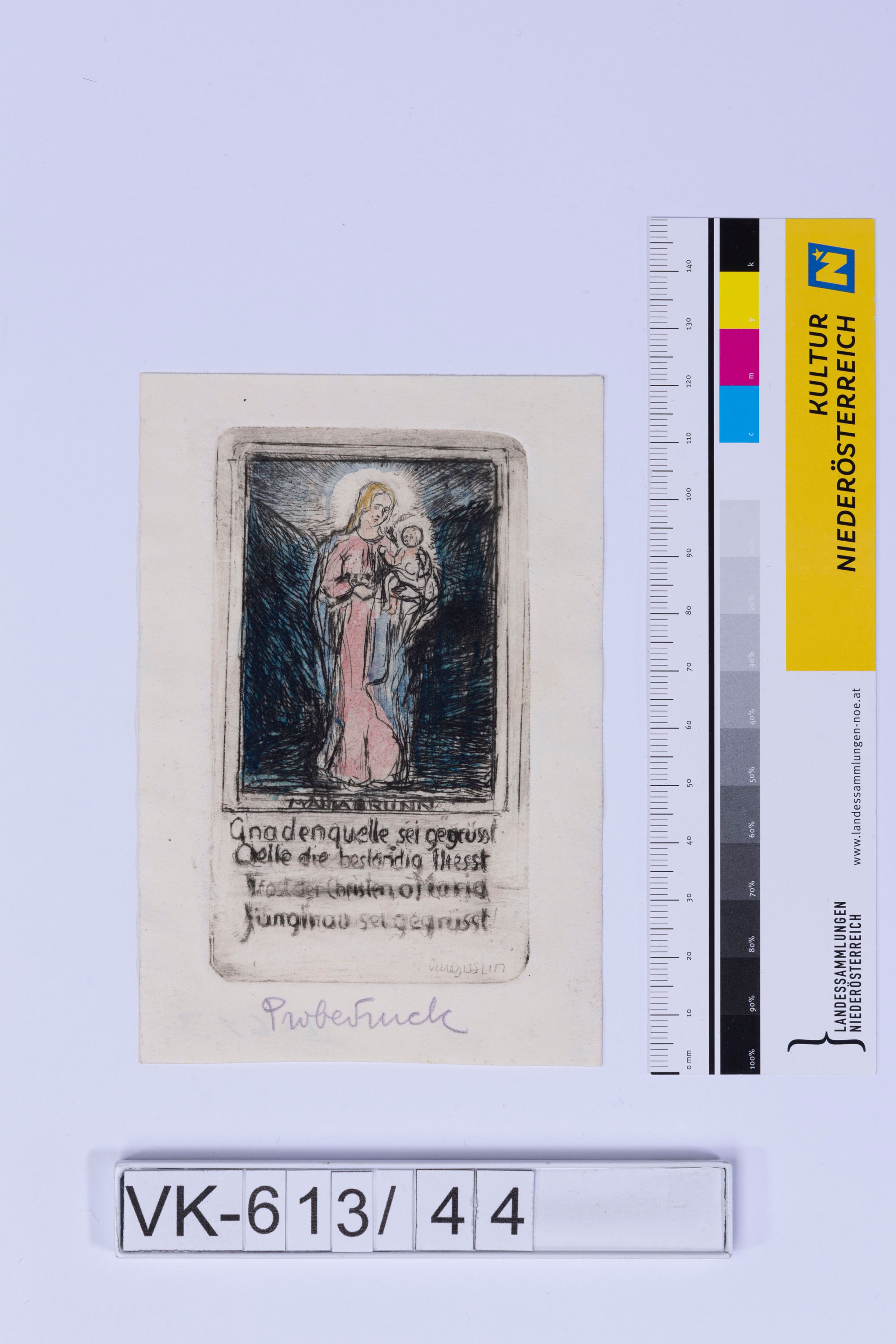 Heiligendarstellung (Maria) mit Kind; Beschriftung: "Gnadenquelle sei gegrüsst Quelle die beständig fliesst Trost der Christen, o Maria Jungfrau sei gegrüsst!", "Probestuck"