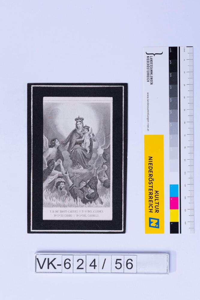 Sterbeandenken; Vorderseite: Mariendarstellung mit Kind und Betenden, Beschriftung: "N.D.DU MONT CARMEL [...]."; Rückseite: Sterbedaten, Gebet