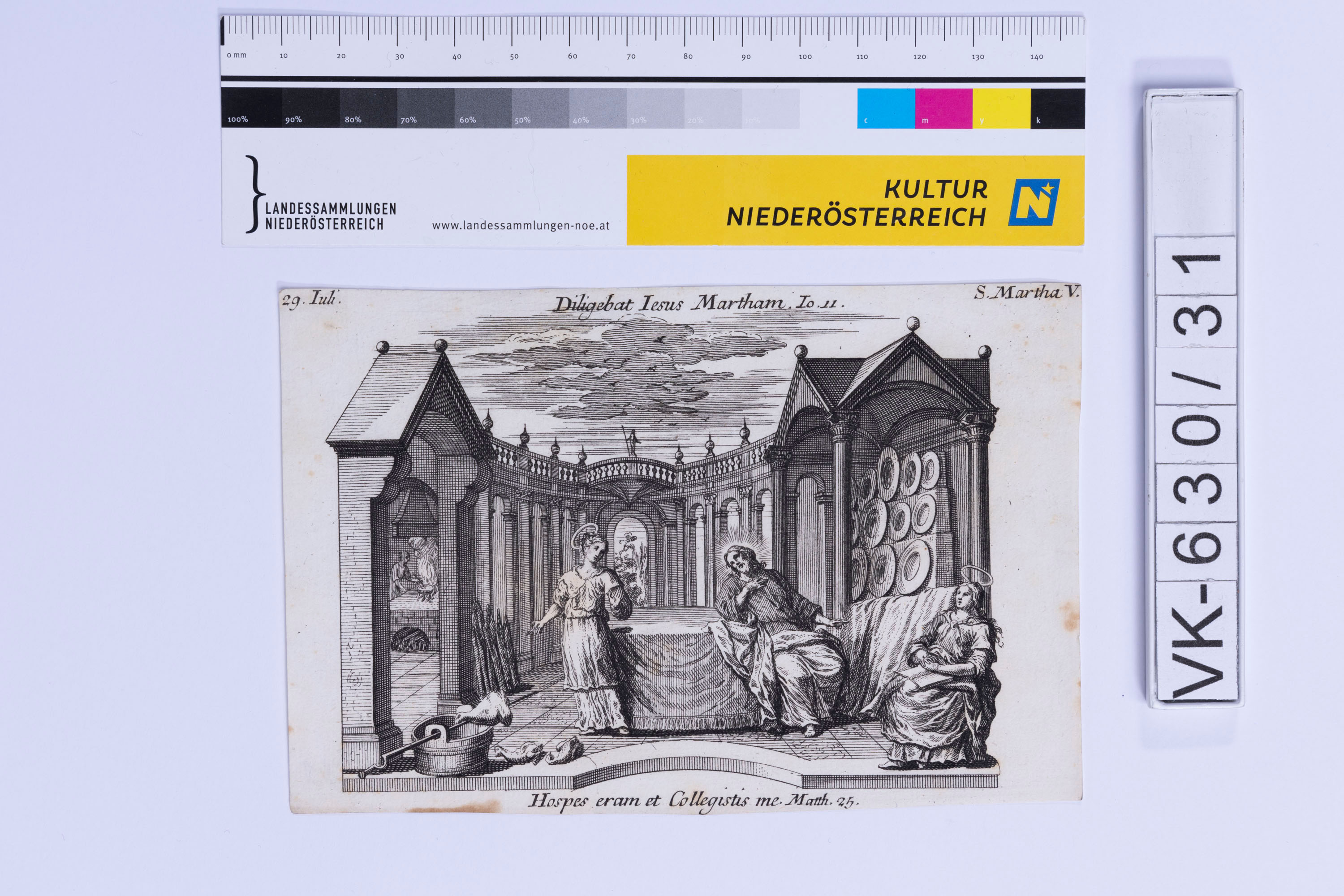 Heiligendarstellung (Martha) mit Jesus in einer Gebäudeszenerie, lateinische Beschriftung