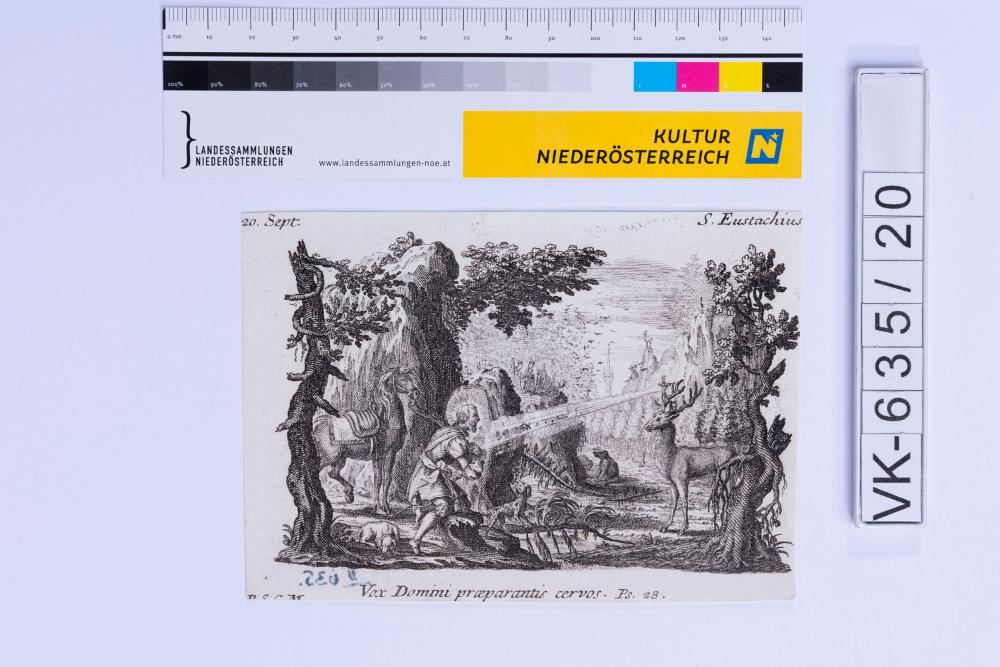 Heiligendarstellung (Eustachius) mit Hirsch und Kreuz in ländlicher Szenerie, lateinische Beschriftung