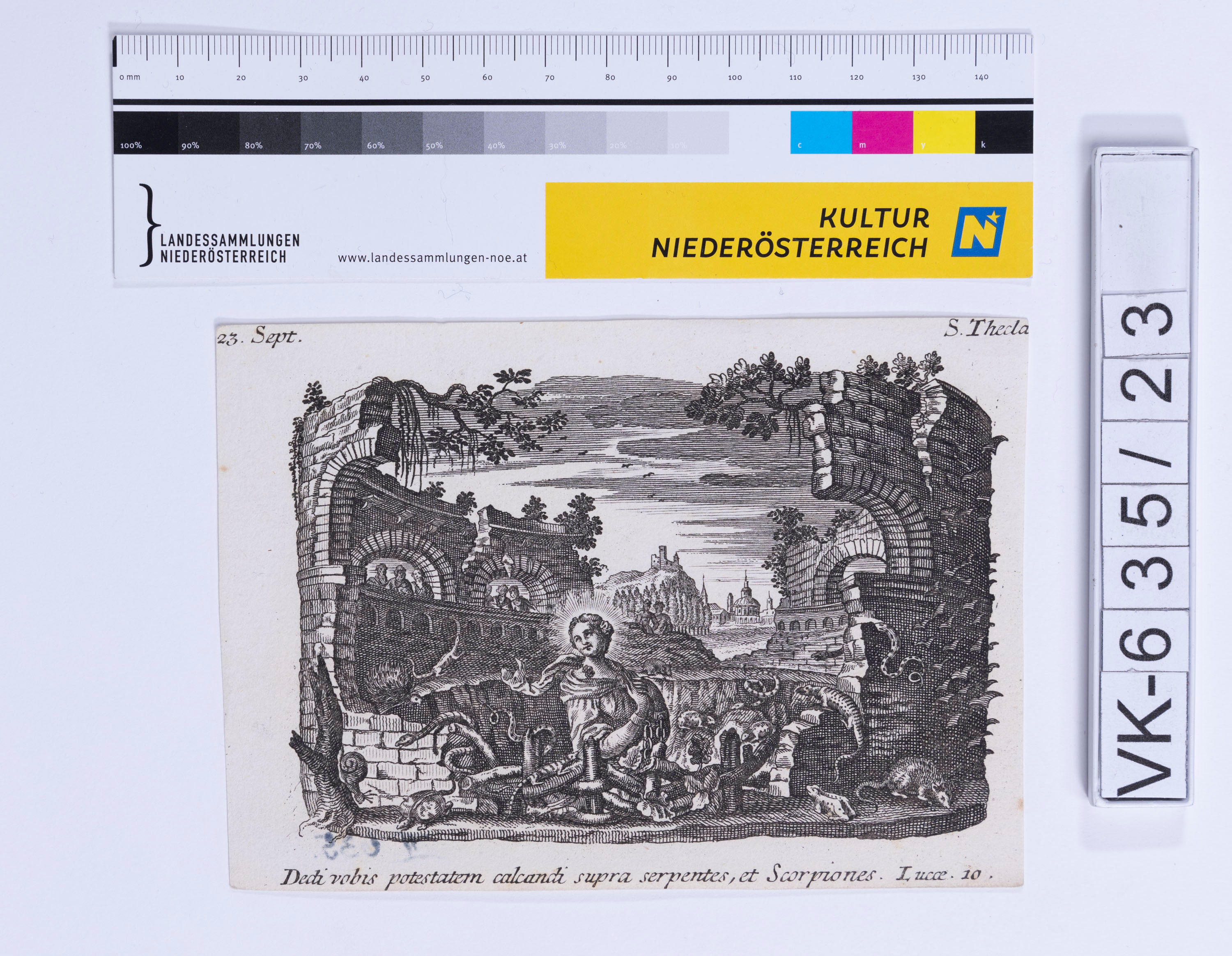 Heiligendarstellung (Thekla) mit Tieren in einer ländlichen und Gebäudeszenerie, Bibelzitat
