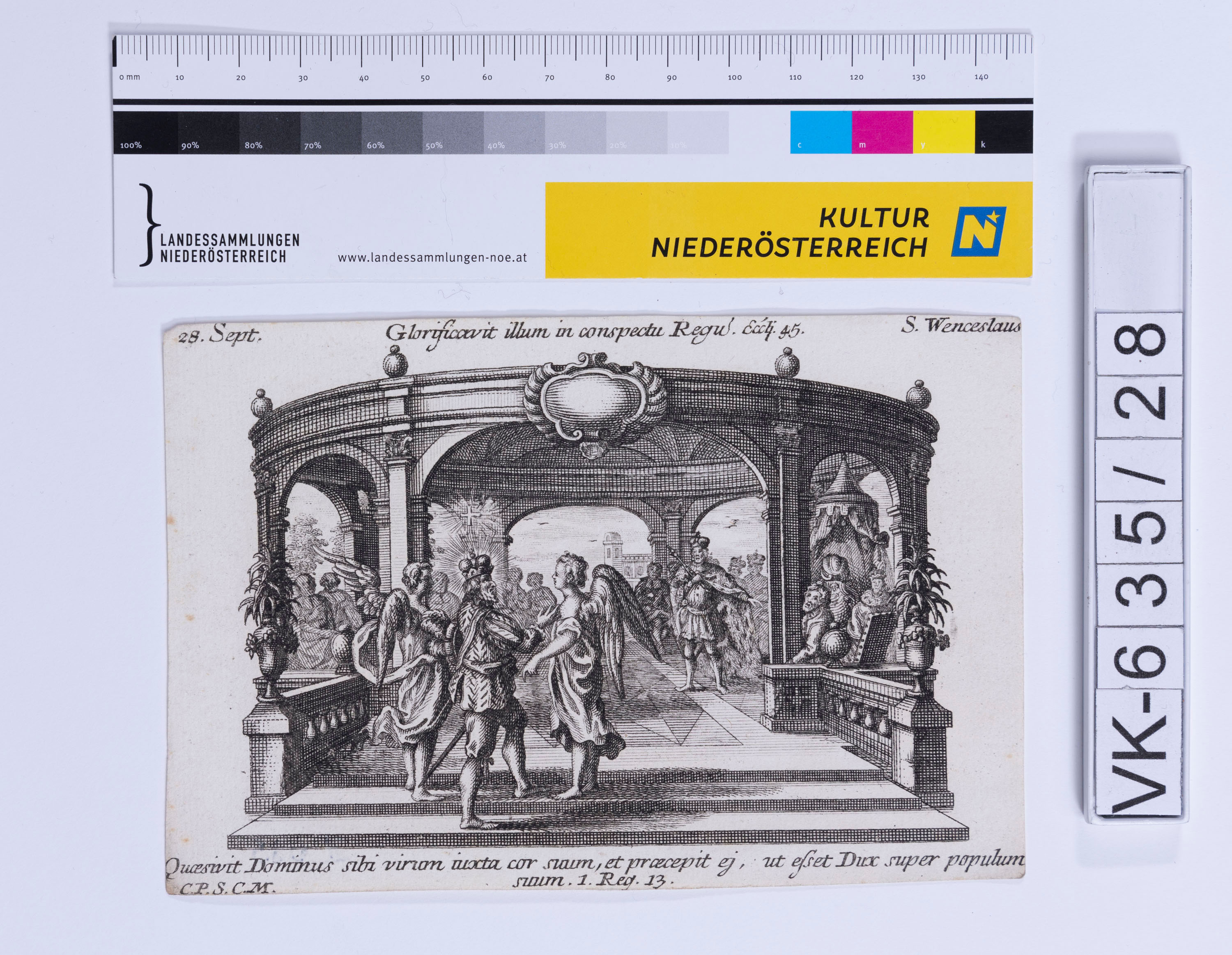 Heiligendarstellung (Wenzel) in einer architektonische Szenerie mit Engeln und Adeligen, Bibelzitat