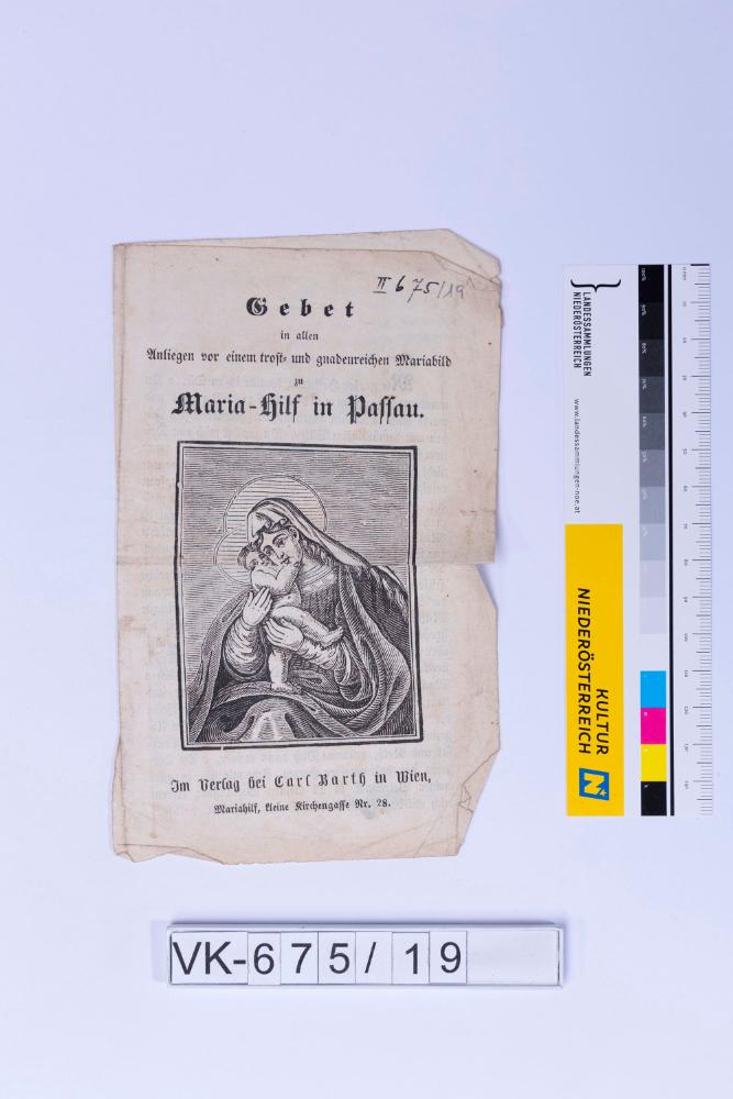 Gebetsheftchen; Vorderseite: Gnadenbild Maria Hilf, "Gebeth in allen Anliegen vor einem trost= und gnadenreichen Mariabild zu Maria-Hilf in Passau."; Innen- und Rückseite: Gebetstext