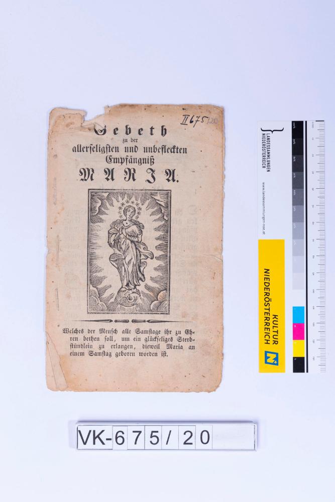 Gebetsheftchen; Vorderseite: Mariendarstellung, "Gebeth zu der allerselgisten und beflecktem Empfängniß MARIA."; Innen- und Rückseite: Gebetstext