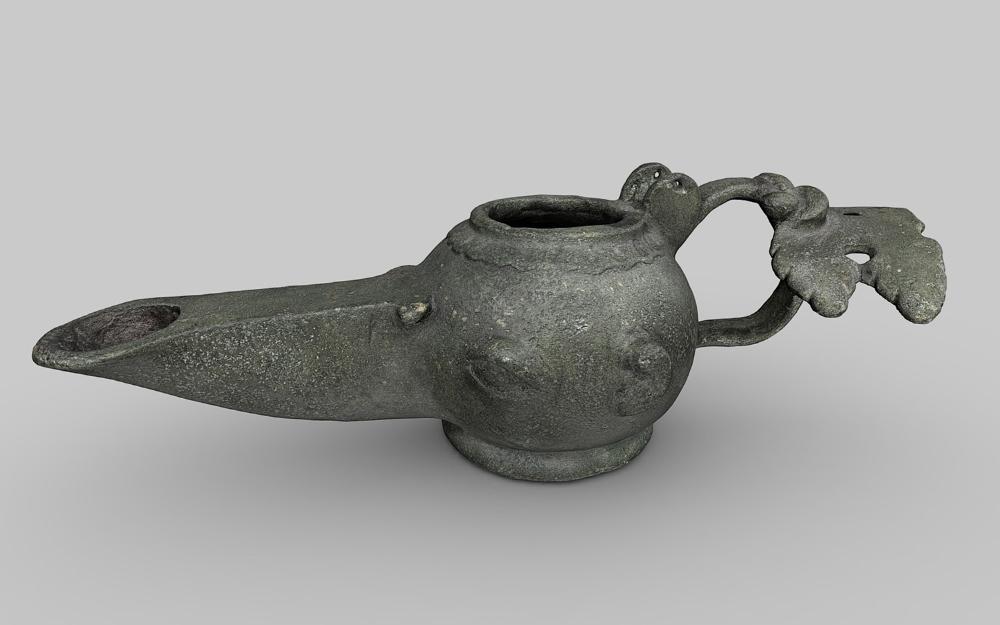 Die Lampe ist als stilisierter, menschlicher Kopf mit aufragenden Augen mit Lider und Ohren gestaltet. Die Nase wurde zu einer langgestreckten, am Ende gerundeten Schnauze umgeformt, aus der die Flamme hervorkommt. Der Ringgriff mit bandförmigem Querschnitt am Scheitel trägt einen gelochten, flachen blattförmigen Henkelaufsatz. Der obere, schließbare Deckelteil für profiliertem Ölloch ist nicht erhalten. Der Standring ist niedrig und profiliert.