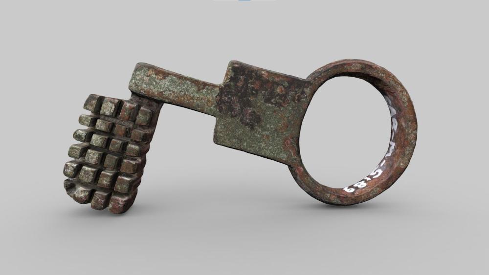Schiebeschlüssel mit unterständigen Zinken und im Querschnitt rechteckigem Schaft. Die Ringöse und der Schaft sind stark vom Griff abgesetzt. Der abgewinkelte Bart besteht aus vierundzwanzig im Querschnitt rechteckigen Zinken.