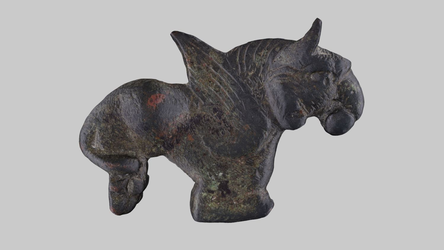 Der Greif hockt auf seinen Hinterbeinen, die Vorderpranken sind zum Teil abgebrochen. Die Federn und Fell-Details sind mit feinen Kerben angedeutet. Auf der Rückseite sind zwei fragmentierte Befestigungsniete erhalten.