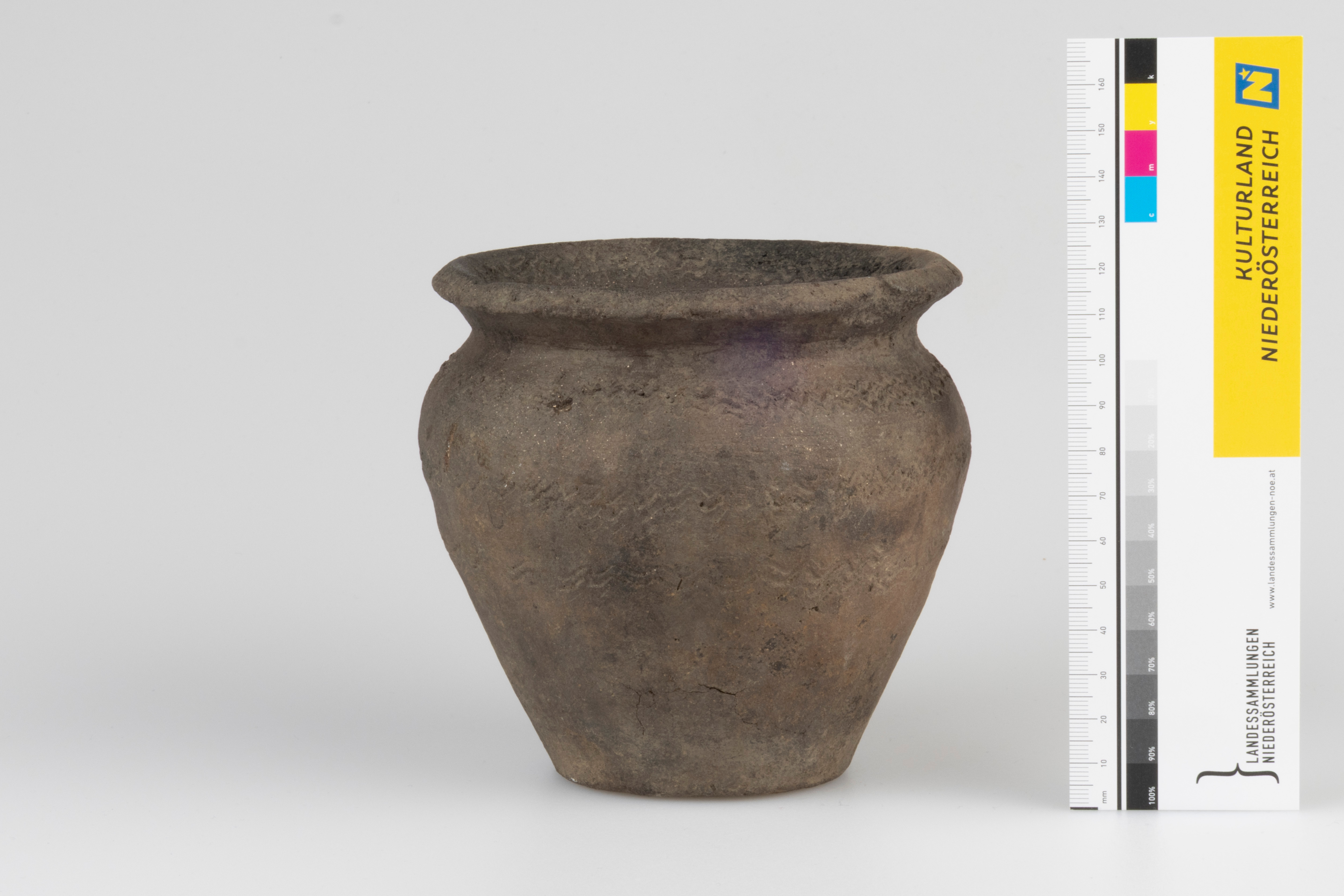 Topf; vollständig erhalten; Rdm. 10,7 cm, max. Dm. 12,6 cm, Bodm. 6,5 cm, H. 11,8 cm, goldglimmerhaltig (Korngröße bis 1 mm, gleichmäßig verteilt), Keramikgruppe B; langsam gedreht, Bodenmarke: vierspeichiges Radkreuz (Dm. 2,7 cm), wenige senkrechte Fingerspuren, innen unten waagrechte Verstreichspuren, außen auf der Schulter von der Herstellung herrührende Ritzspuren; ausladender, schräg abgestrichener Rand; am abgestrichenen Rand mit einem einfachen, auf der Randinnenseite, Schulter und Unterteil mit doppelten, waagrecht umlaufenden Wellenbändern verziert; Farbe: außen rotbraun und wenig grau, innen dunkelgrau, Mischbrand