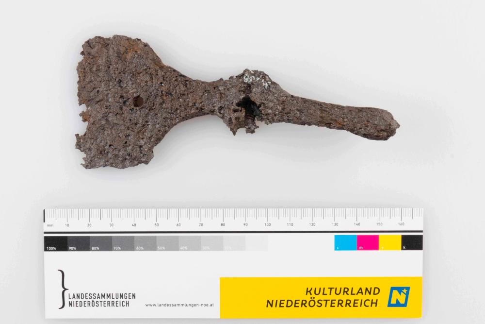 Axt; Eisen; Schaftloch und Schneiden stark korrodiert, zum Teil halbrunde Reste der Schaftlochlappen vorhanden; langer, walzenförmiger, zum Ende verdickter Nacken mit rundem Qu., leicht asymmetrisches, trapezförmiges Blatt; breite, geschwungene Schneide, beidseitiger markanter Halsausschnitt; L. 14,2 cm, B. 5,9 cm, SchaftlochDm. 2,4 × 1,7 cm; Blatt mit einem regelmäßig runden Loch (Wangenloch) mit Dm. 0,4–0,5 cm versehen; Gewicht 101,4 g