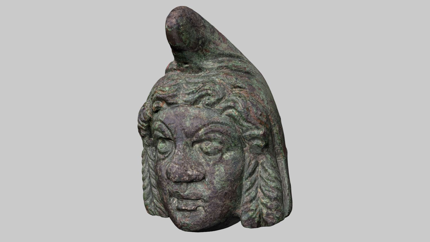 Der männliche Kopf (Attis oder Mithras) blickt geradeaus. Das lockige Haar ist in der Mitte gescheitelt, zwei kurze Zöpfe bilden den unteren Abschluss der Frisur. Die Haardetails sind mit Kerben angedeutet. Auf dem Kopf trägt er eine phrygische Mütze mit seitlich verlängerten Enden, die laschenartig herunterhängen. Auf der Rückseite befindet sich ein Ansatz mit kreisförmigem Querschnitt.