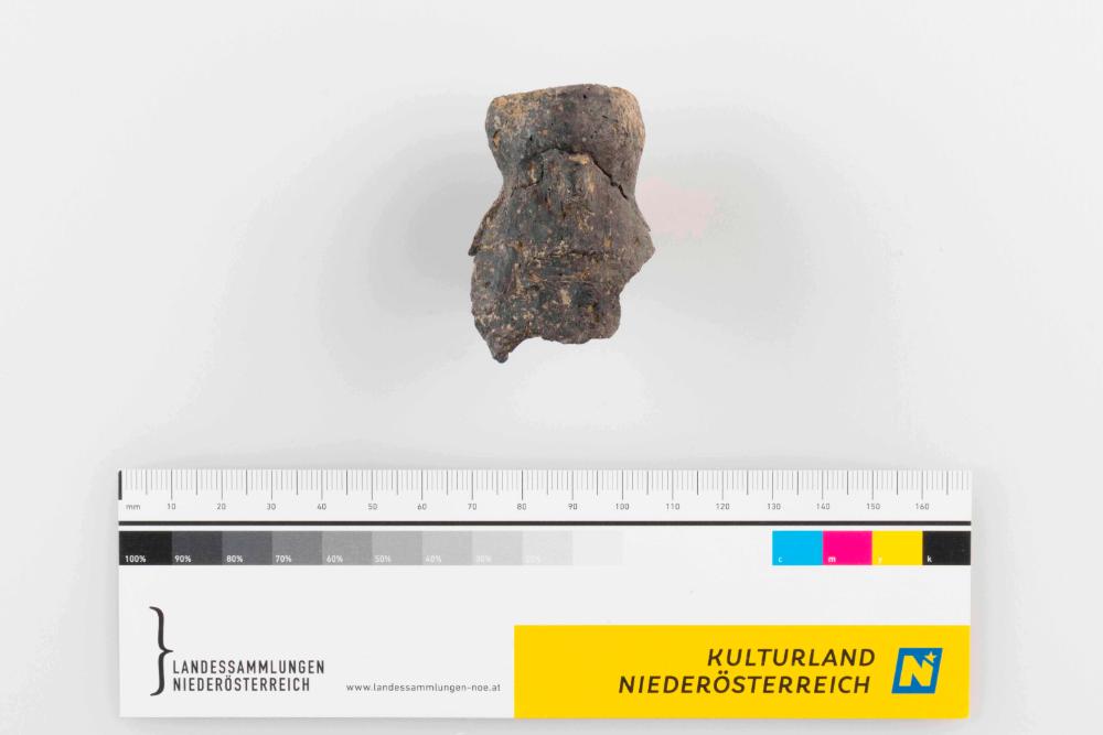 Keramikobjekt mit stark schematisierter Darstellung eines menschlichen Gesichts. Das Artefakt könnte ursprünglich ein Bestandteil eines Gefäßes unbekannter Form oder eines anderen Keramikobjekts gewesen sein. Der schwarz gebrannte Ton ist mit Vegetabilien sowie in geringem Maß mit Sand und kleinen Steinchen gemagert. Er ist bemerkenswert weich und schlecht gebrannt. Die Oberseite des Objekts ähnelt einer Knubbe mit tiefer Innendelle. An der Basis der Knubbe ist eine halbplastisch modellierte Nase zu sehen, darüber sind zwei nur leicht eingedrückte Vertiefungen erkennbar, die auf ungewöhnlich nahe beieinander liegende Augen hinweisen. Eine kurze, horizontale, breite Rille an der stark gewölbten Wand kann als Mund interpretiert werden.