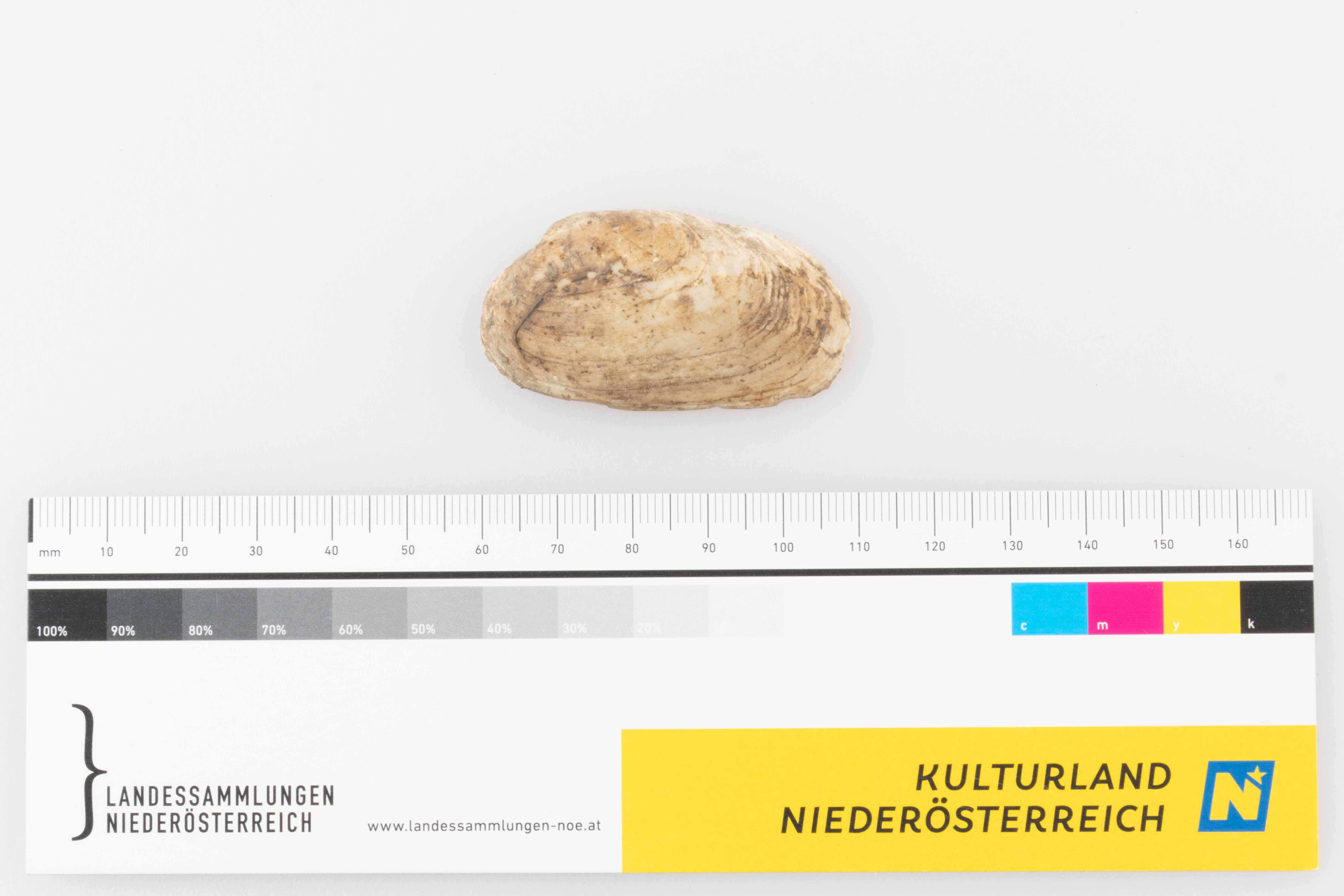 Schale einer Süßwassermuschel. Sie wurde gemeinsam mit weiteren Muschelschalen in einem Topf ausgegraben, was auf eine Nutzung zu kulinarischen Zwecken schließen lässt.