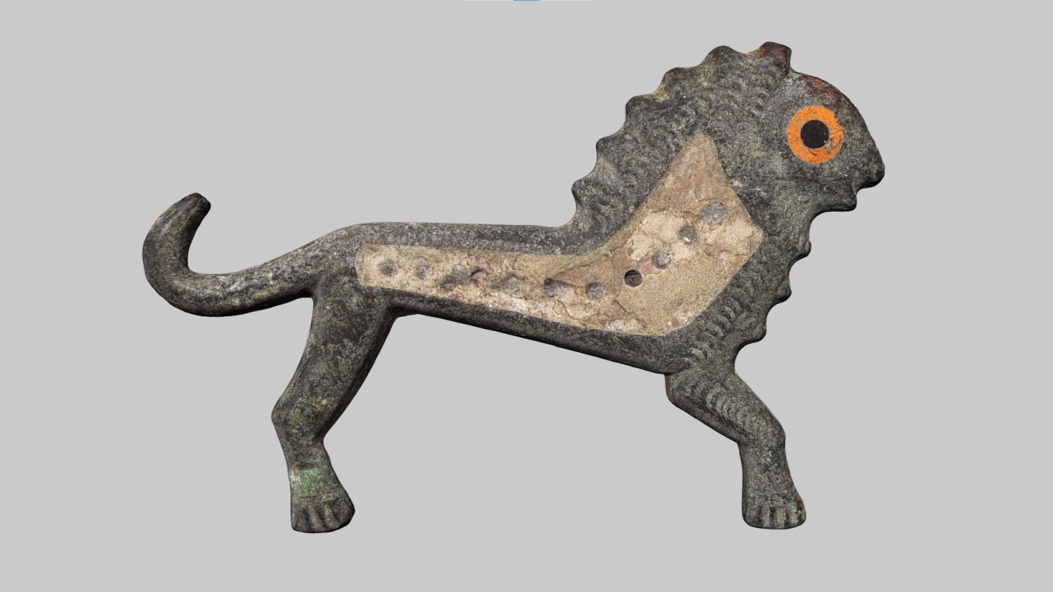 Der Löwe ist stehend nach rechts abgebildet. Die Beine sind leicht abgewinkelt, das Maul ist geöffnet. Das Auge ist mit orangefarbenem und schwarzem Email ausgefüllt. Der Körper hat einen beigen, emaillierten Untergrund und zehn ursprünglich mit Email ausgefüllte Grübchen. Er ist flach abgebildet. Die zickzackförmige Mähne und die Beine sind mit Kerben verziert. Der Schwanz ist nach oben gebogen. Der Nadelhalter ist hoch, die Nadel fehlt.