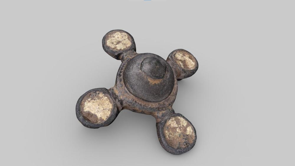 Die stufenförmig aufgebaute Scheibe mit gekerbter Randleiste trägt einen kegelförmig aufgewölbten, hohlen Mittelteil, der mit einem Knopf abschließt. Am Rand befinden sich vier scheibenförmige Rundeln, die mit fragmentierter, beiger Emaileinlage ausgefüllt sind. Die Oberfläche ist verzinnt. Die Backenscharnierkonstruktion und die Nadel sind vollständig erhalten.