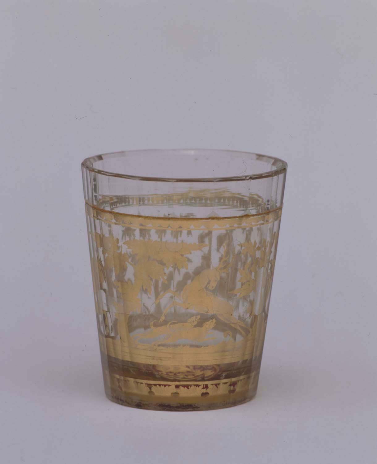 Becherglas mit geraden Faltenzügen und Goldradierung, eine Hundehatz auf einen Hirsch in Landschaftsszene darstellend.