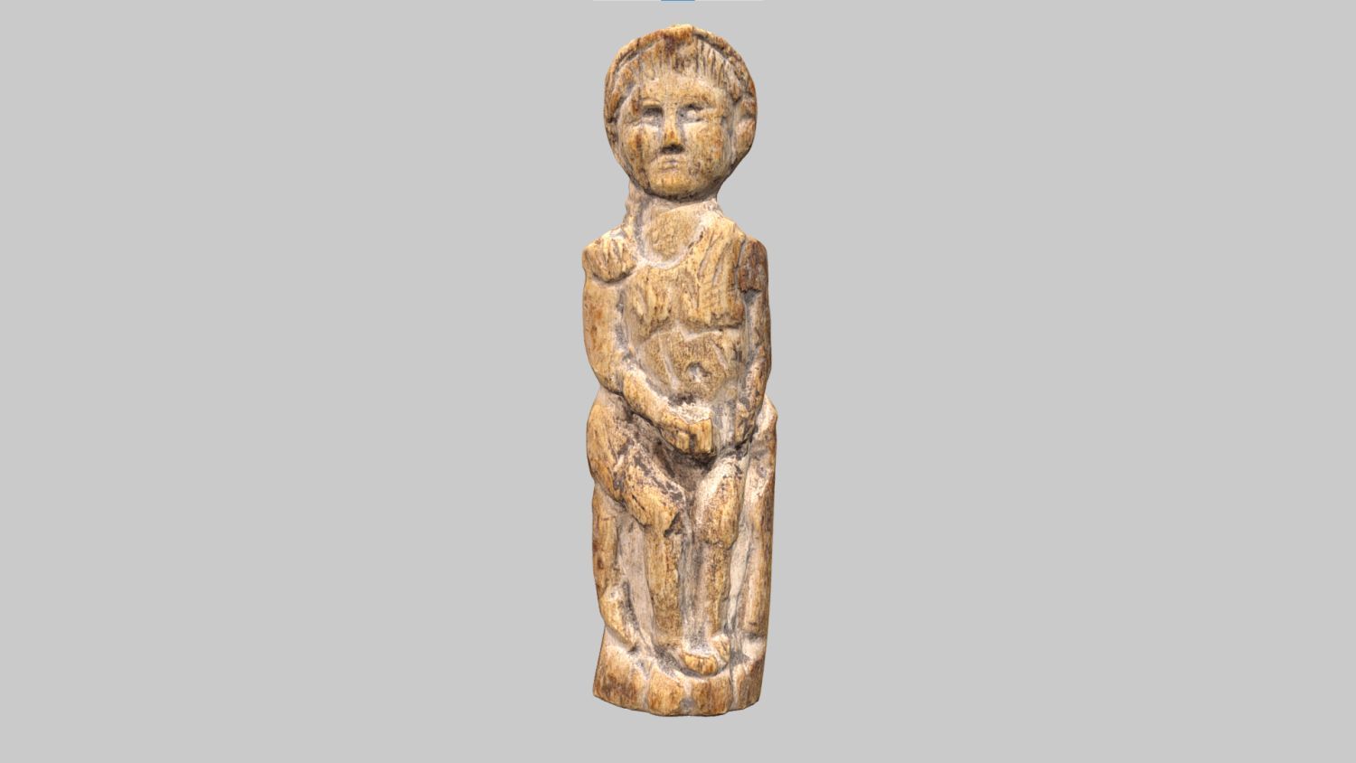 Die Statuette einer Figur, die auf einem Klappsessel sitzt. Die Figur ist in ein gefaltetes Gewand gehüllt. Das Haar ist in alle Richtungen herabgestrichen. Die Frisur auf der Rückseite ist teilweise mit Schräglinien und einem Rautenmuster verziert. Die Rückseite ist teilweise plastisch ausgearbeitet. Seitlich vom schematisch angedeuteten Klappsessel befinden sich zwei längliche, rechteckige Ansätze, die mit geritzten Schräglinien verziert sind. Die Oberfläche ist poliert.