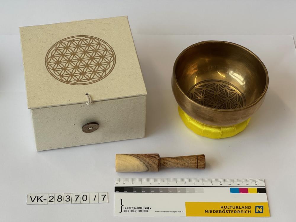 Klangschale aus Messing mit einem Holzschlägel, einem torusförmigen Standpolster und einer Kartonschachtel. Die Klangschale ist mit einer "Blume des Lebens" im Spiegel verziert. Der Verkäufer des Produkts schreibt darüber auf seiner Website: "Handgehämmerte Klangschale mit Blume des Lebens Gravur. Diese Klangschalen sehen nicht nur wunderschön aus, sie haben auch eine große Schwingungswirkung. Die Kraft der Blume des Lebens, des Ursymbols für Manifestation schwingt bei jeder Drehung der Klangschale mit und hilft uns tiefer in unsere eigene Mitte zu kommen, Blockaden zu lösen und neue Lebensenergie freizusetzen".