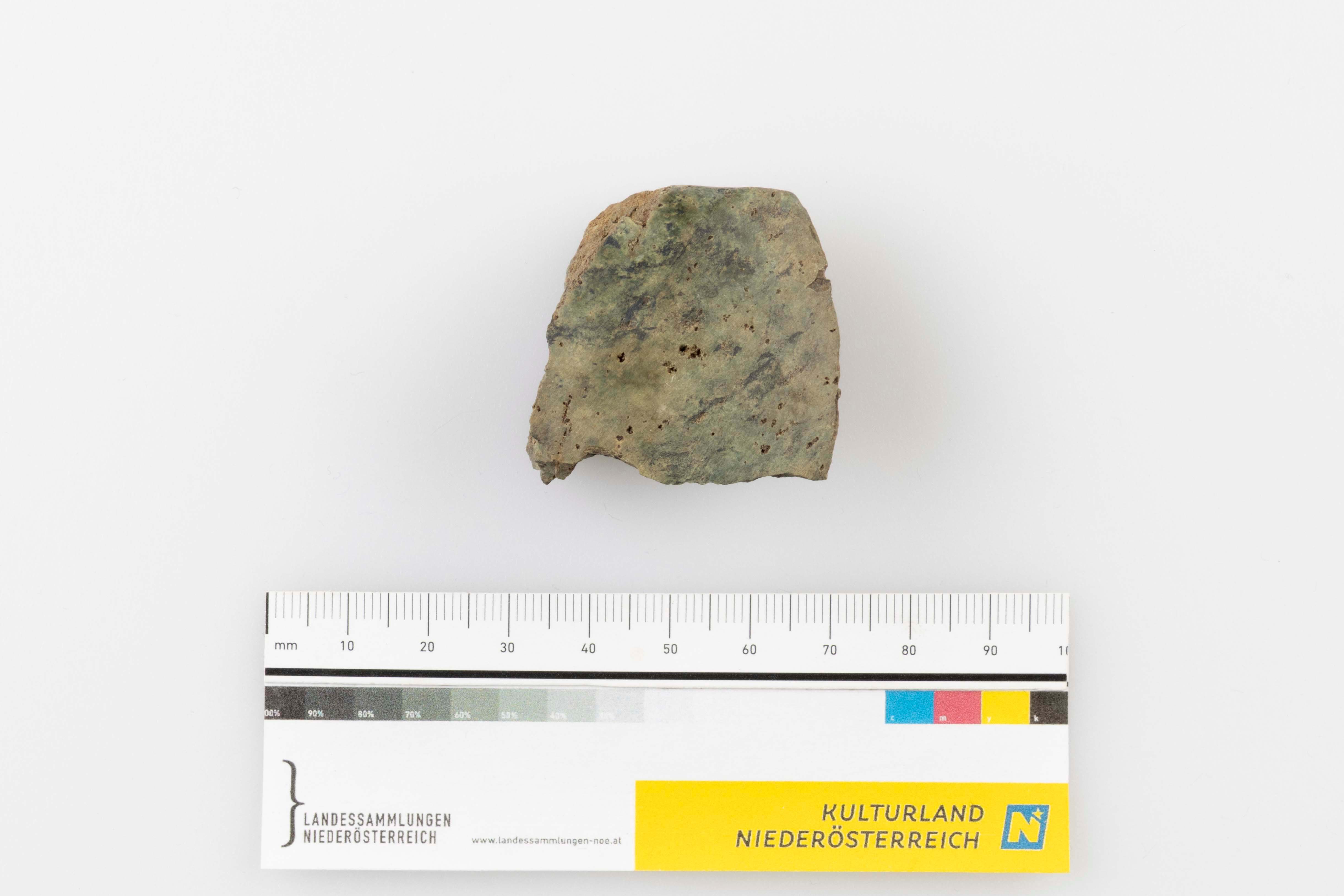 Schneidenbruchstück eines Steinbeils mit gerundeter Schneide und Ansatz einer geraden Seitenbahn. Erhaltene L × B × D: 4,0 × 3,7 × 2,1 cm.