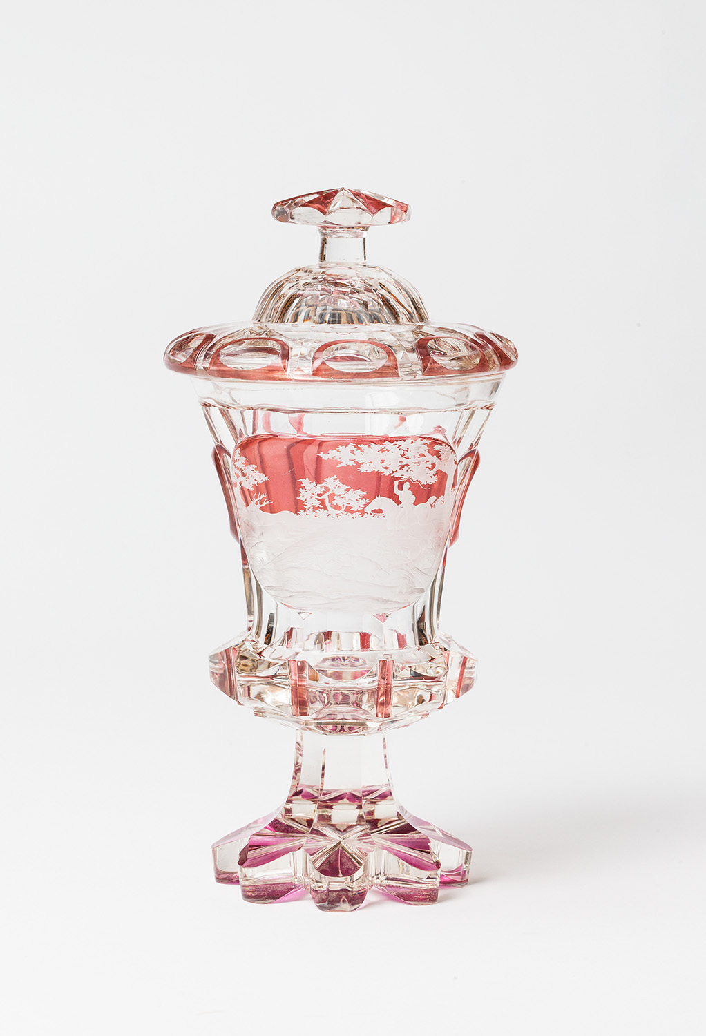 Facettiertes Pokalglas mit Deckel mit geschliffenen Knorren, Spiegelfeldern und roter Beizung. Gravierte Darstellungen von Hirsch, Hirschkuh, Hunden und Reiter in Landschaftsszenen.