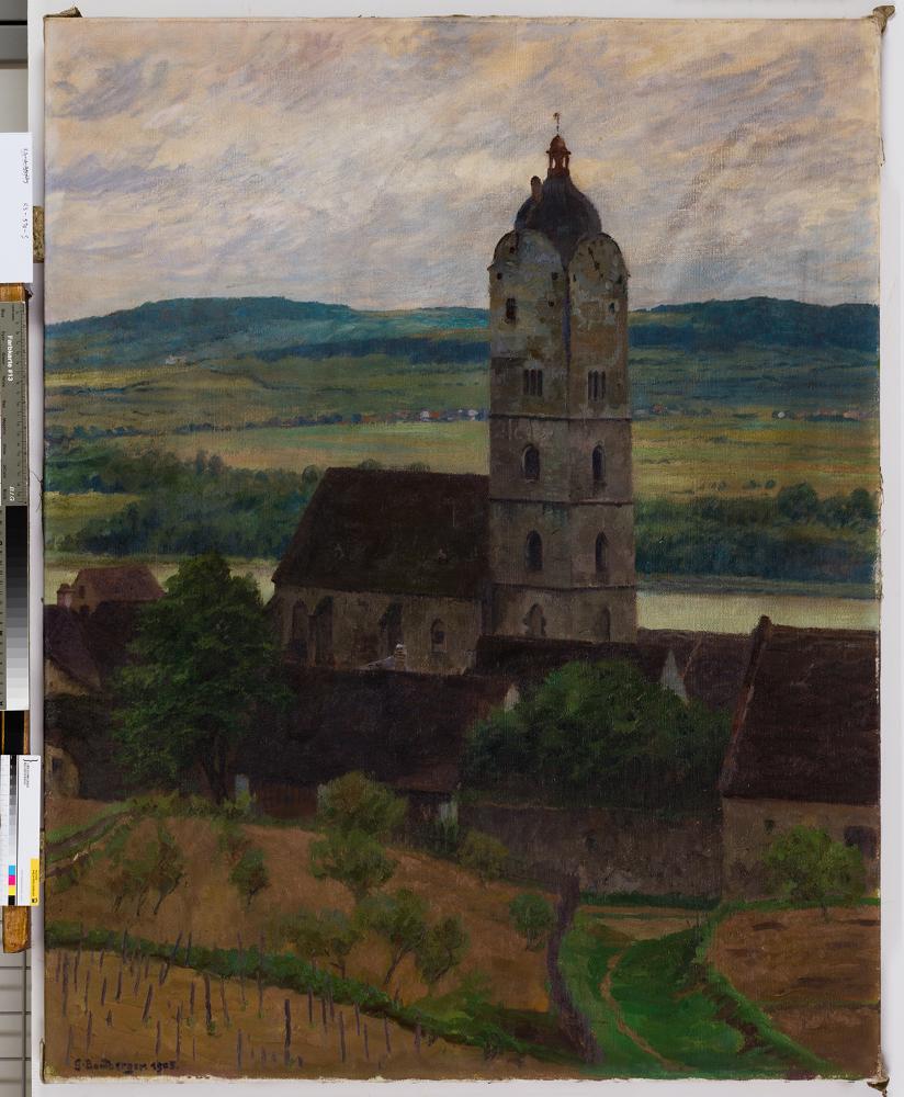 Signaturli. unten sign. und dat.: "G. Bamberger. 1905"; rücks. (am Keilrahmen) bez.: "Frauenkirche in Stein" und Klebezettel: "Steiner Frauenturm S. 3500"