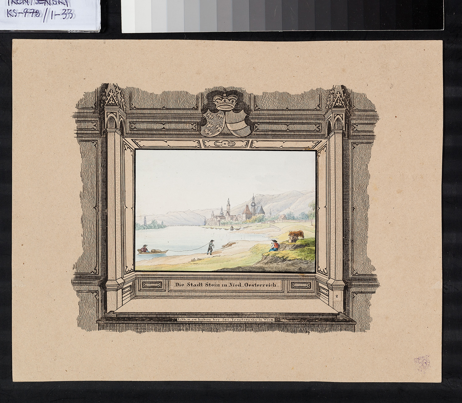 Signaturbez.: "Die Stadt Stein in Nied. Oesterreich" und "Lith. u. zu haben bey Jos. Trentsensky in Wien." re. unten (am Trägerblatt) aufgeklebte Num.: "8"