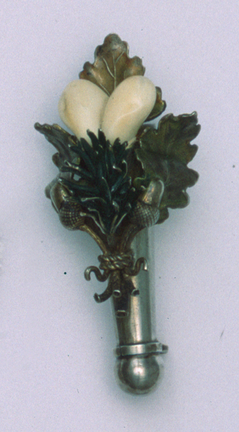 Hutagraffe für einen (fehlenden) Gamsbart oder Federschmuck mit Eichenlaub, Eicheln und Hirschgrandeln.