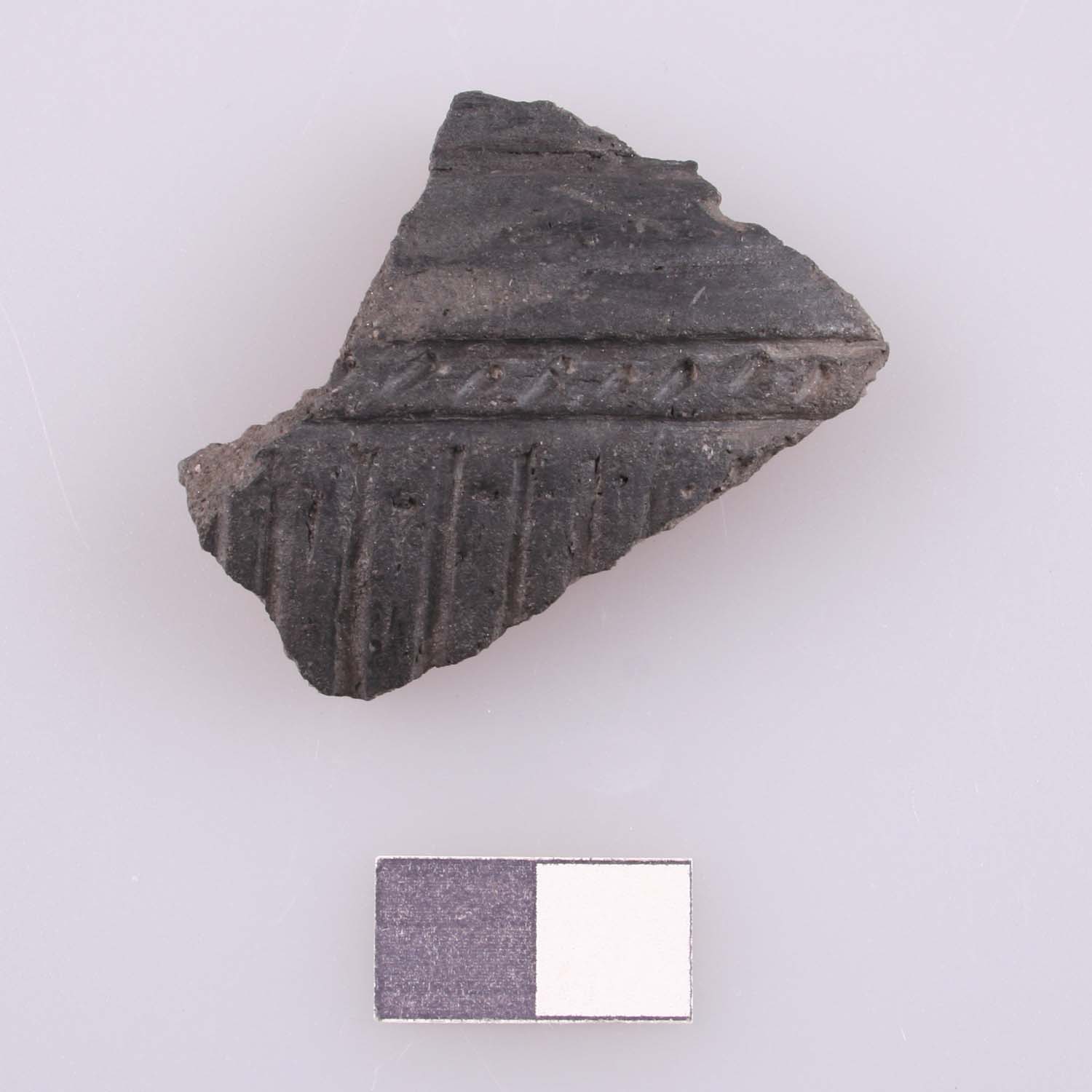Wandbruchstück mit umlaufender, durch zwei Linien eingegrenzter Einstichkerbenreihe und senkrechten, parallelen Linien