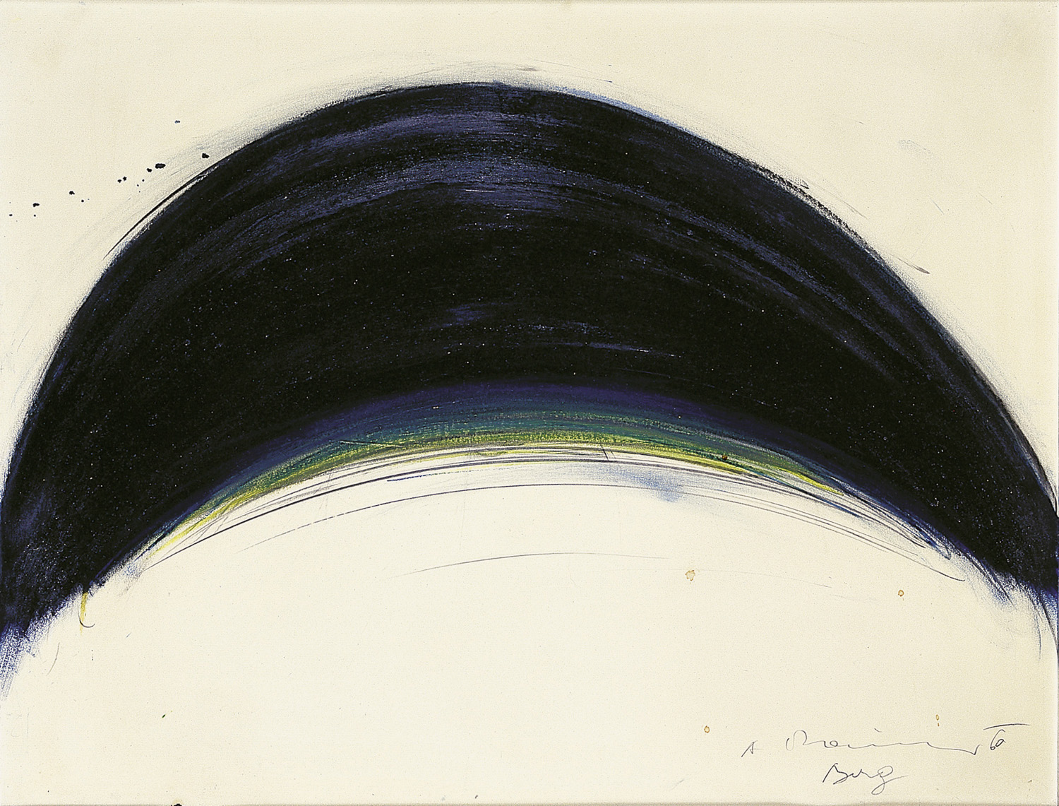 1953 bis 1965 entstand Arnulf Rainers wichtigste Werkgruppe, die "Übermalungen". Waren sie in den fünfziger Jahren weitgehend durch radikales Zumalen und fast vollständige Überdeckung des jeweiligen Bildsujets gekennzeichnet, kam es Anfang der sechziger Jahre zu einer Veränderung im Selbstverständnis des Übermalens: Nicht mehr das vollständige Zudecken, das Zum-Verschwinden-Bringen, war nun vorrangig, sondern die offene "Übermalungsstrategie". In Form von Bogen, Kurven oder Farbbündelungen wurden dynamische Bildfelder geschaffen. Der akzentuierte Pinselfarbstrich leitete von der Flächigkeit der frühen Übermalungen zu einem differenzierten, ansatzweise zeichnerischen Malgestus über, und der ursprünglich monochrome Charakter entwickelte sich - wie an diesem Beispiel bereits deutlich zu erkennen ist - zu einer nuancierten Farbigkeit.