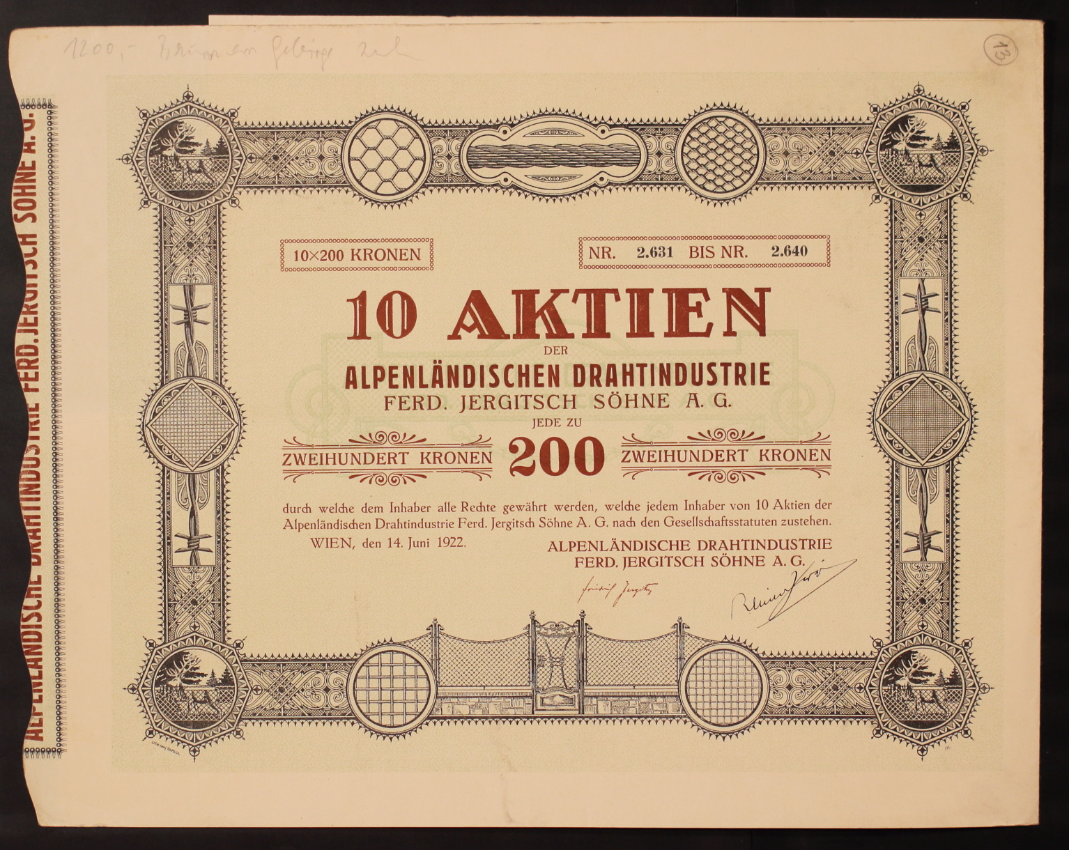 10x200 Kronen, Nr 2.631 bis Nr. 2.640. 10 Aktien der Alpenländischen Drahtindustrie, Ferd.Jergitsch Söhne AG (Brunn/Gebirge) jede zu 200 Kronen durch welche dem Inhaber alle Rechte gewährt werden, welche jedem Inhaber von 10 Aktien der Alpenländischen Drahtndustrie, Ferd.Jergitsch Söhne A.G. nach dem Gesellschaftsstatuten zustehen. Wien, den 14. Juni 1922. Alpenländische Drahtindustrie, Ferd.Jergitsch Söhne A.G. [Unterschriften unleserlich].