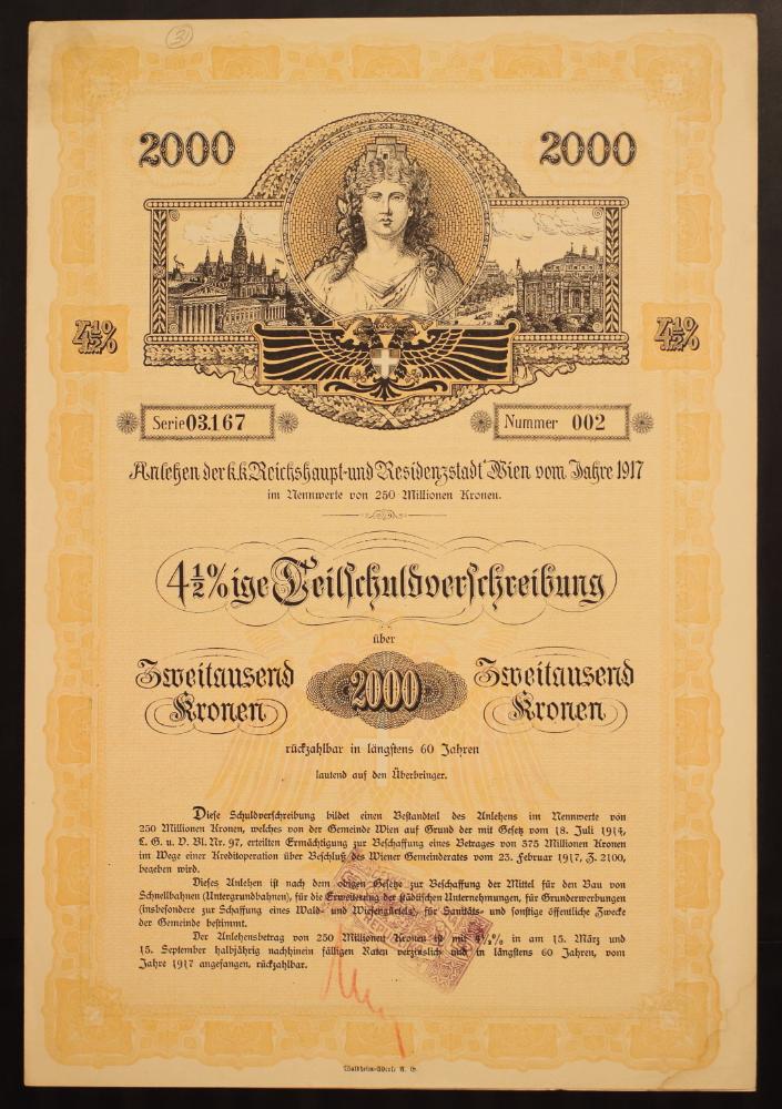 Serie 03.167, Nummer 002. Anlehen der k.k.Reichshaupt- und Residenzstadt Wien vom Jahre 1917 im Nennwerte von 250 Millionen Kronen. 4 ½ %ige Schuldverschreibung über 2000 zweitausend Kronen, rückzahlbar in längstens 60 Jahren, lautend auf den Überbringer. Diese Schuldverschreibung bildet einen Bestandteil des Anlehens im Nennwerte von 250 Millionen Kronen, welches von der Gemeinde Wien von dem auf Grund der mit Gesetz vom 18. Juli 1914, L.G.Bl. u. V.Bl. Nr. 97, erteilten Ermächtigung zur Beschaffung eines Betrages von 375 Millionen Kronen im Wege einer Kreditoperation über Beschluß des Wiener Gemeinderates vom 23. Februar 1917, Z. 2100, begeben wird. Dieses Anlehen ist nach dem obigen Gesetze zur Beschaffung der Mittel für den Bau von Schnellbahnen (Untergrundbahnen), für die Erweiterung der städtischen Unternehmungen, für Grunderwerbungen, insbesondere zur Schaffung eines Wald- und Wiesengürtels, für Approvisionierungs-, Sanitäts- und sonstige öffentliche Zwecke der Gemeinde bestimmt. Der Anlehensteilbetrag von 250 Millionen Kronen ist mit 4 ½ % in am 1. März imd 15. September halbjährig nachhinein fälligen Raten verzinslich und in längstens 60 Jahren, vom Jahre 1917 angefangen, rückzahlbar...Wien am 15. März 1917. [Facsimileunterschriften: Vize-Bürgermeister, Bürgermeister, und Stadtrat unleserlich].“