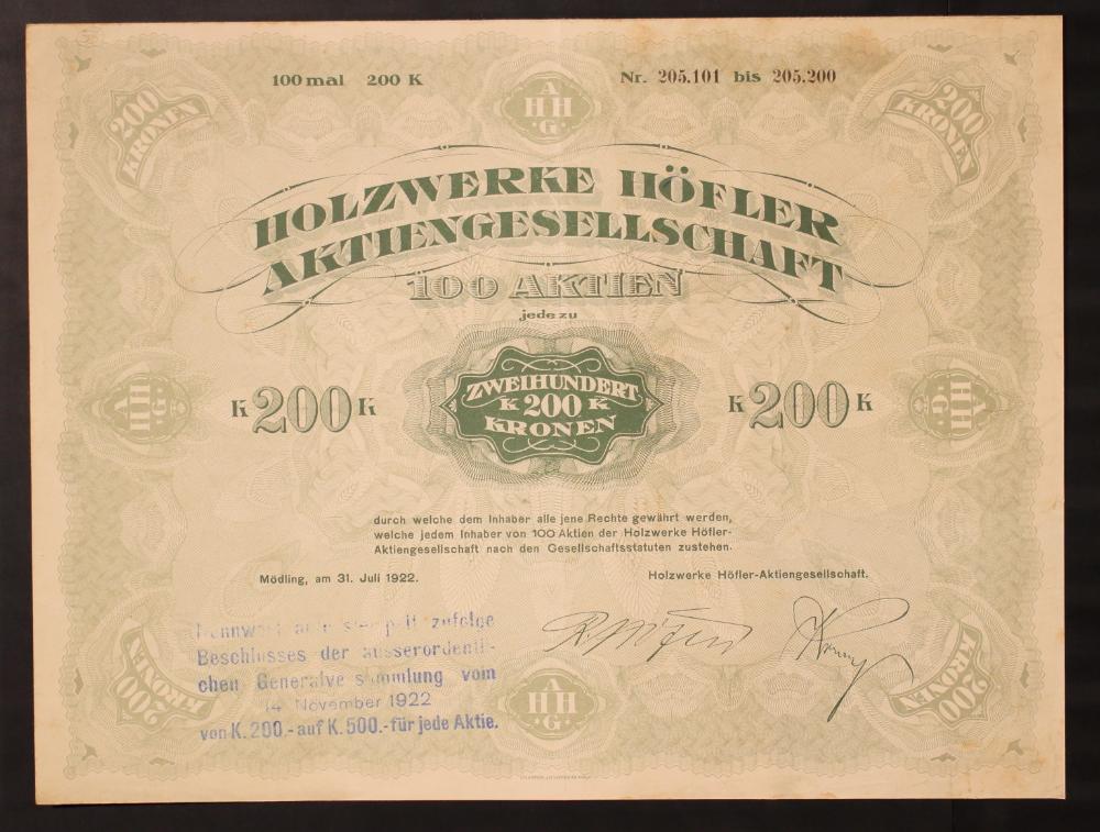 100 mal 200 K. Nr. 205.101 bis 205.200. Holzwerke Höfler Aktiengesellschaft. 100 Aktien, jede zu 200 Zweihundert Kronen durch welche dem Inhaber alle jene Rechte gewährt werden, welche jedem Inhaber von 100 Aktien der Holzwerke Höfler Aktiengesellschaft nach den Gesellschaftsstatuten zustehen. Holzwerke Höfler-Aktiengesellschaft: [Unterschriften unleserlich].