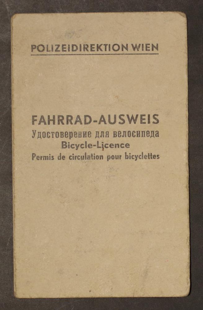 Fahrrad-Ausweis, viersprachig (Deutsch, Russisch, Englisch, Französisch), ausgestellt von der Polizeidirektion Wien für Frau Brodmann Maria.